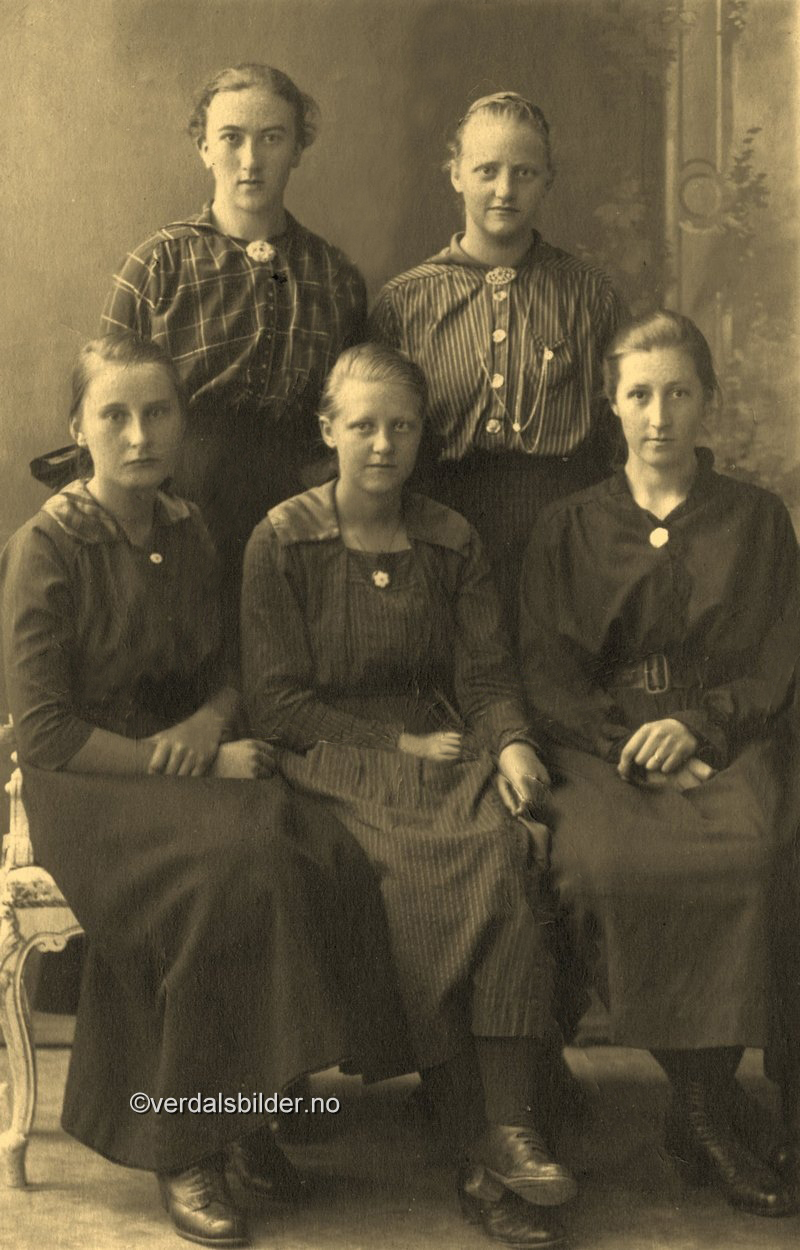 | Fem unge damer omkring år 1920 . Se flere navnsatte bilder Før markør opp til haka på personene for å få opp navn |