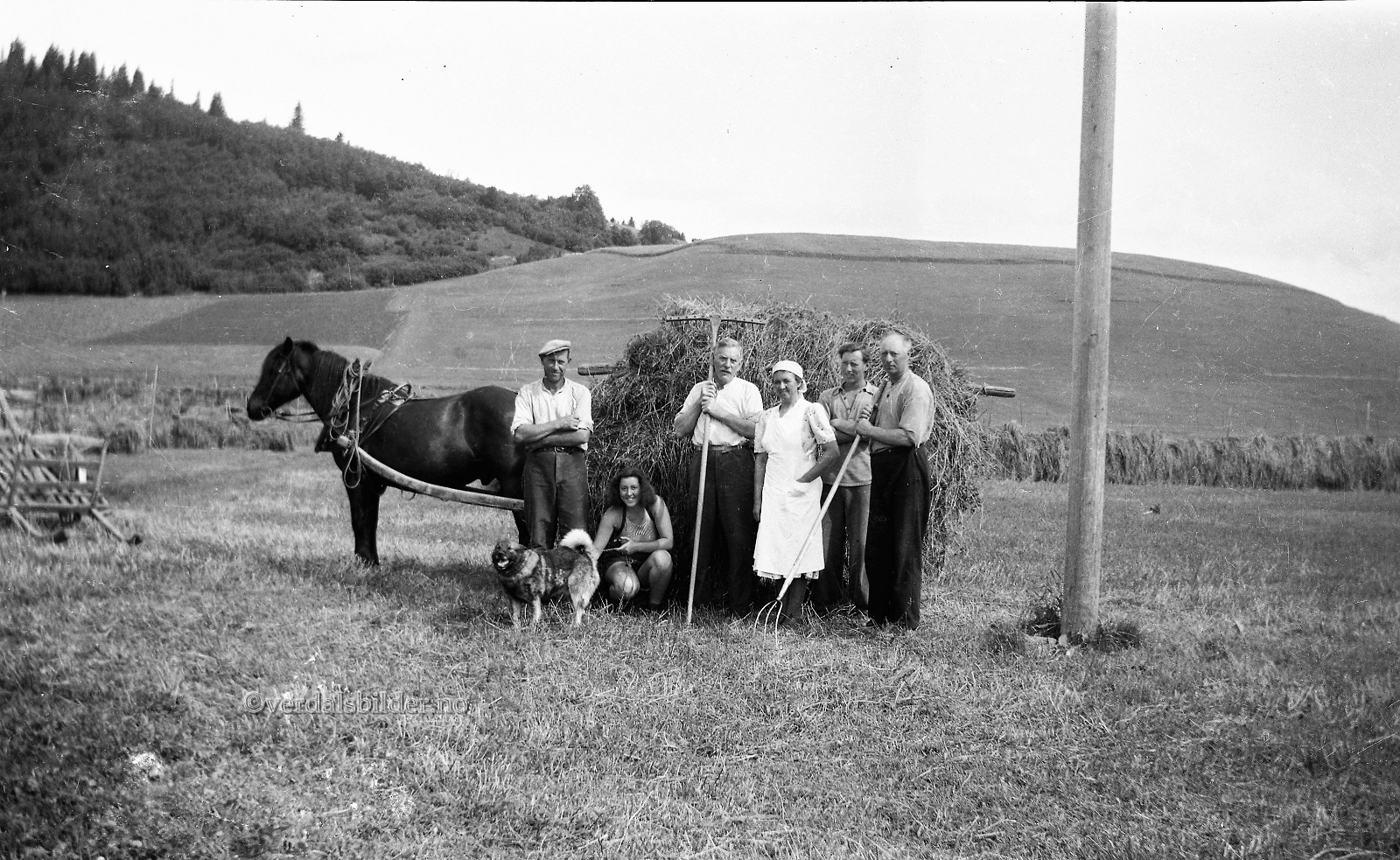 Høykjøring i Fåra rundt 1946. -- Hjelp med navna, Per Johan Jermstad. Bildet utlånt av Grete Forbregd. Har du korrigeringer, nye navn eller en kommentar? Ring eller send sms til 472 97 311 eller 456 00 950 Det beste er å sende en E-post til: post@verdalsbilder.no Tips noen om dette bildet : Klikk her Forstørre bildet Bruk ctrl-knapp + musehjul oppover for å forstørre bildet. Bruk ctrl-knapp + musehjul nedover for å forminske bildet Du kan også bruke "ctrl-knapp" samtidig med "+" og "-" på det numeriske tastaturet. "Ctrl" og "*" (eller null) tilbakestiller størrelsen | ||||