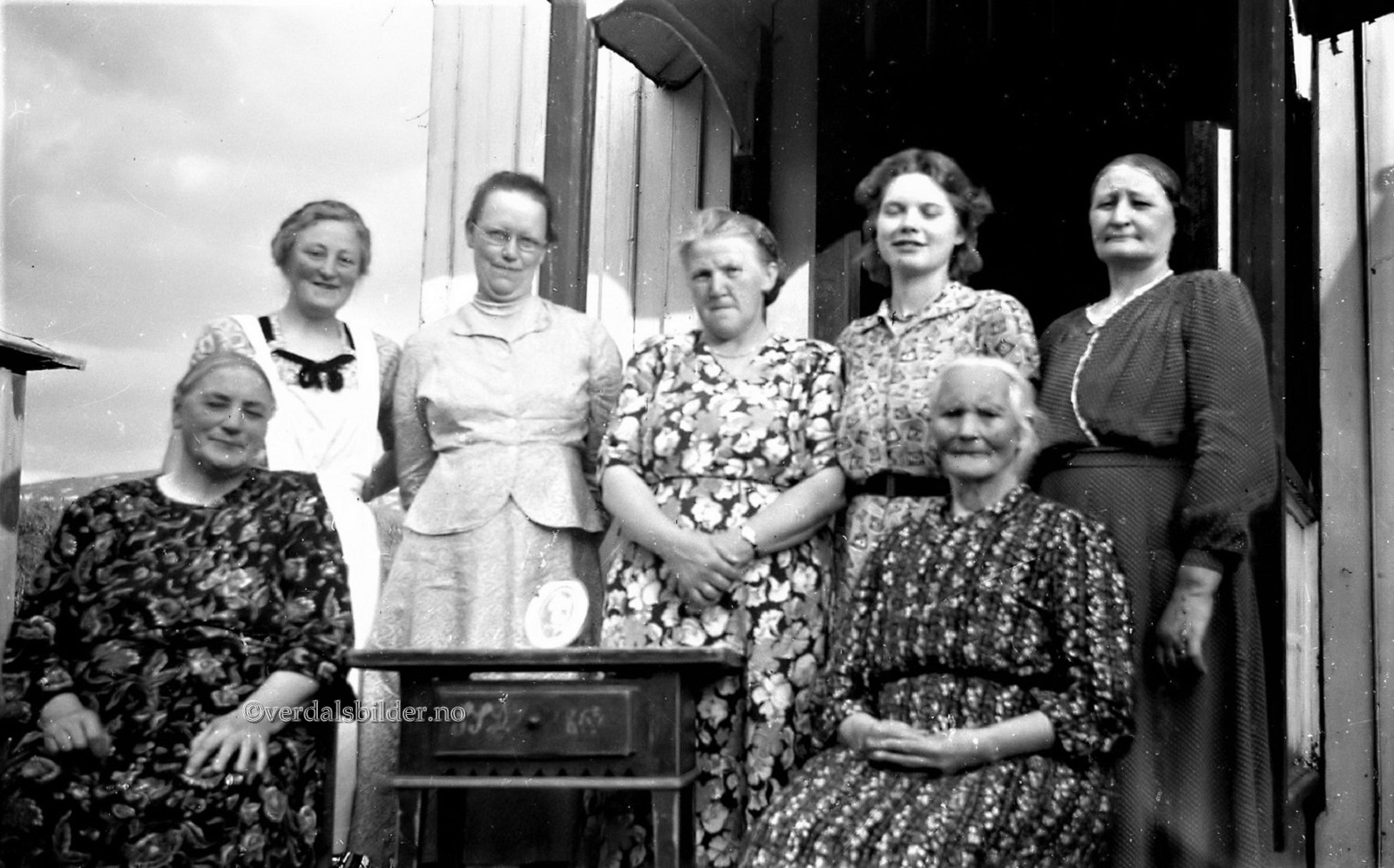 Sju damer fra Helgådalen samlet på Bakken i 1954 -- Navna hentet fra Helgådalens bildearkiv. Utlånt av Jan Danielsson. Bildet er vel tatt i forbindelse med Ingeborg Klukens besøk fra Amerika. Foreldrene hennes, Bernt Iver og Jette Leirset Kluken, utvandret i 1901. Ukjent fotograf. Har du korrigeringer, nye navn eller en kommentar? Ring eller send sms til 472 97 311 eller 456 00 950 Det beste er å sende en E-post til: post@verdalsbilder.no Tips noen om dette bildet : Klikk her Forstørre bildet Bruk ctrl-knapp + musehjul oppover for å forstørre bildet. Bruk ctrl-knapp + musehjul nedover for å forminske bildet Du kan også bruke "ctrl-knapp" samtidig med "+" og "-" på det numeriske tastaturet. "Ctrl" og "*" (eller null) tilbakestiller størrelsen | ||||