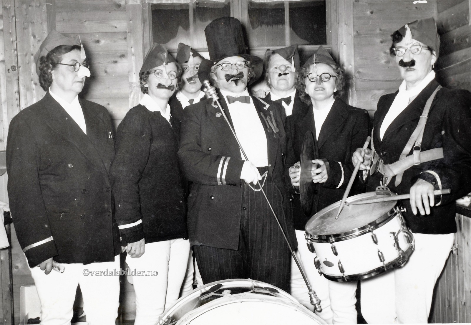 Vassfest i klubbhuset i Folkeparken rundt 1955. -- Medlemmer i spareforeningene «Hukra» og «Skravla» på Tinden underholder i ektefellenes underbukser på festen. Tindbyggene feirer at de har fått kommunalt vatn. Utlånt med navna av Gerd Flyum. Har du korrigeringer, nye navn eller en kommentar? Ring eller send sms til 472 97 311 eller 456 00 950 Det beste er å sende en E-post til: post@verdalsbilder.no Tips noen om dette bildet : Klikk her Forstørre bildet Bruk ctrl-knapp + musehjul oppover for å forstørre bildet. Bruk ctrl-knapp + musehjul nedover for å forminske bildet Du kan også bruke "ctrl-knapp" samtidig med "+" og "-" på det numeriske tastaturet. "Ctrl" og "*" (eller null) tilbakestiller størrelsen | ||||