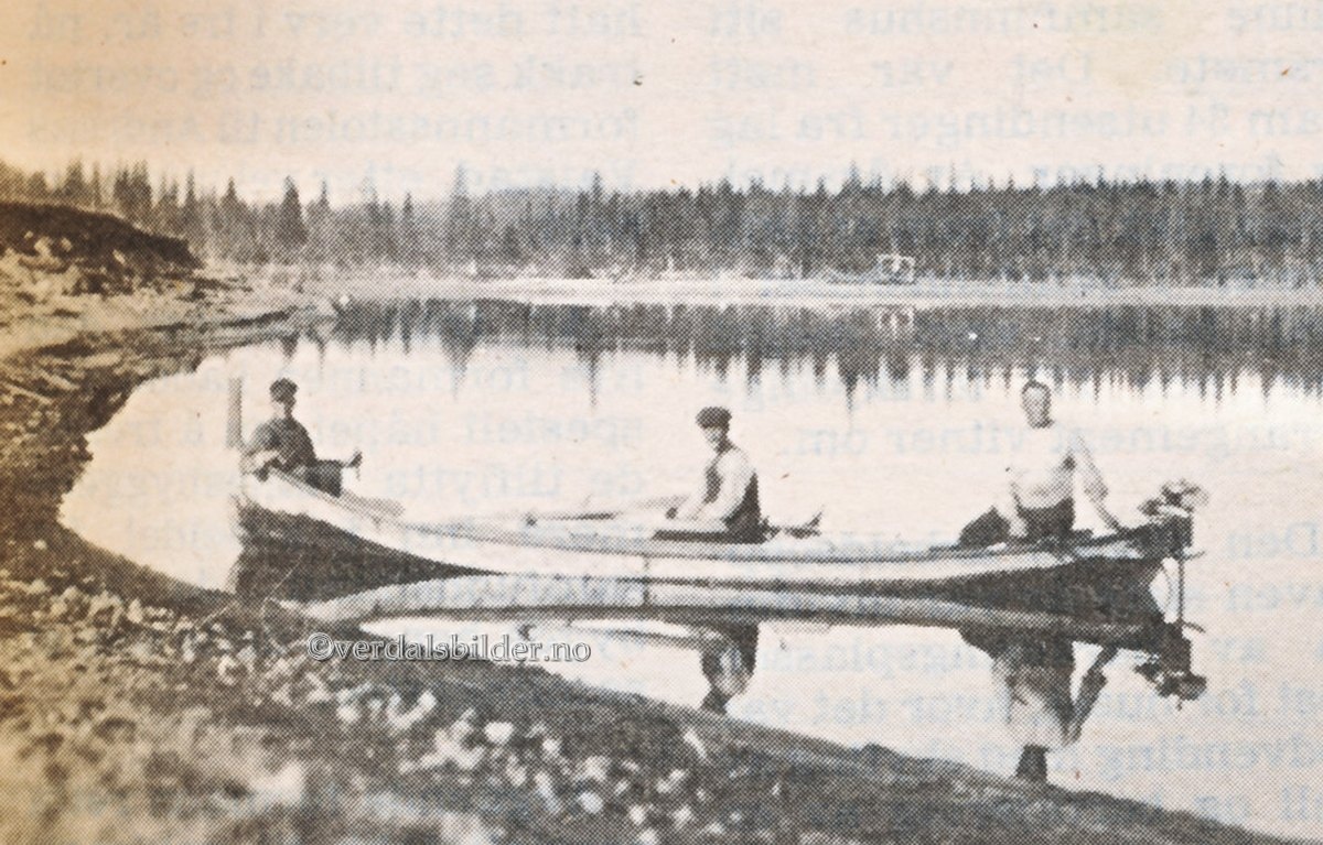 Første motorbåt på Veresvatnet i 1924 -- Fotografen hadde fjernutløser og sitter i båten nærmest land. Navn og bilde hentet fra avisklipp i Verdalingen fra 1981. Har du korrigeringer, nye navn eller en kommentar? Ring eller send sms til 472 97 311 eller 456 00 950 Det beste er å sende en E-post til: post@verdalsbilder.no Tips noen om dette bildet : Klikk her Forstørre bildet Bruk ctrl-knapp + musehjul oppover for å forstørre bildet. Bruk ctrl-knapp + musehjul nedover for å forminske bildet Du kan også bruke "ctrl-knapp" samtidig med "+" og "-" på det numeriske tastaturet. "Ctrl" og "*" (eller null) tilbakestiller størrelsen | ||||