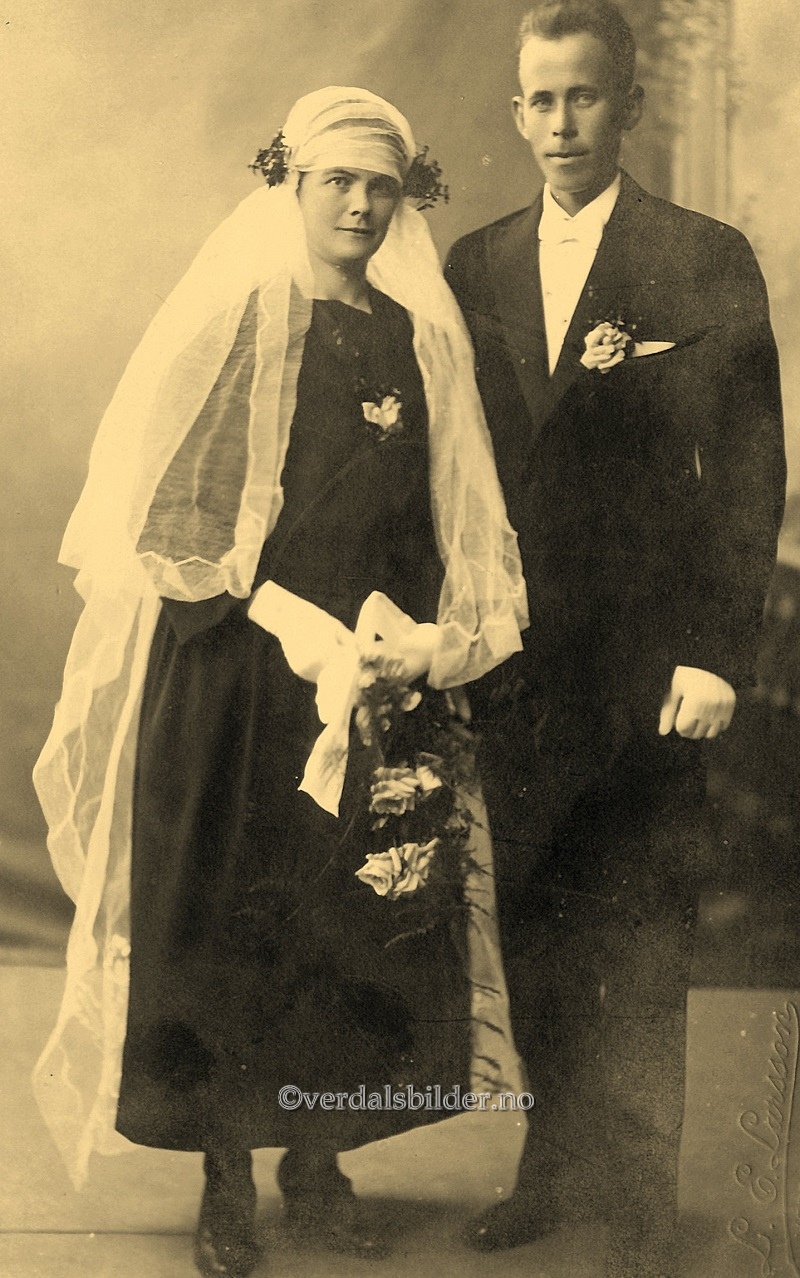 Brudepar fra Helberg i Sjøbygda i 1924. -- Helberg er et småbruk på nordsiden av Nordbergshaugen. Bernhard var født i 1896 og døde i 1961. Foreldre, Iver Andreas Pettersen Helberg og Anna Mikalsdatter. Marie Othelie var fra Trones. Født 1892 og død i 1976. Utlånt med navn av Brit Hogstad Mære. Opplysninger fra boka Norges Bebyggelse. Har du korrigeringer, nye navn eller en kommentar? Ring eller send sms til 472 97 311 eller 456 00 950 Det beste er å sende en E-post til: post@verdalsbilder.no Tips noen om dette bildet : Klikk her Forstørre bildet Bruk ctrl-knapp + musehjul oppover for å forstørre bildet. Bruk ctrl-knapp + musehjul nedover for å forminske bildet Du kan også bruke "ctrl-knapp" samtidig med "+" og "-" på det numeriske tastaturet. "Ctrl" og "*" (eller null) tilbakestiller størrelsen. | ||||