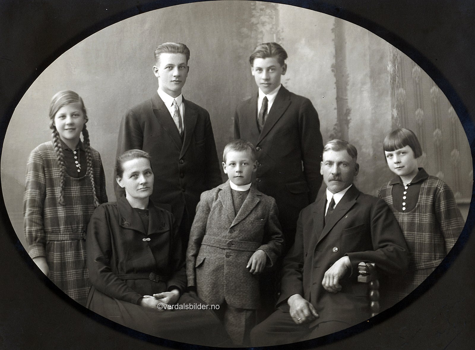 Familien Hogstad på Trones i 1930. -- Utlånt med navna av Eivind Aksnes. Har du korrigeringer, nye navn eller en kommentar? Ring eller send sms til 472 97 311 eller 456 00 950 Det beste er å sende en E-post til: post@verdalsbilder.no Tips noen om dette bildet : Klikk her Forstørre bildet Bruk ctrl-knapp + musehjul oppover for å forstørre bildet. Bruk ctrl-knapp + musehjul nedover for å forminske bildet Du kan også bruke "ctrl-knapp" samtidig med "+" og "-" på det numeriske tastaturet. "Ctrl" og "*" (eller null) tilbakestiller størrelsen | ||||