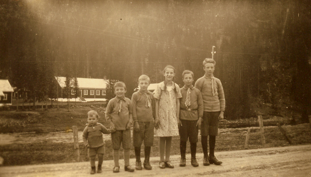 | Seks søsken på rekke og rad ved Vaterholmen omkring 1928. Inna