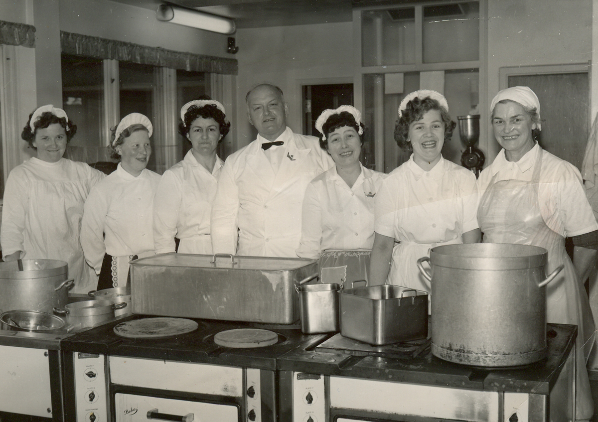 | Kjøkkenpersonalet med bestyrer Alf Dahling på Verdal Samvirklags kafeteria