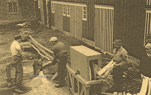 Fra Værdalsbrukets tømmerhogst i Kverndalen i 1924. Karene som tar en pause ser betenkt ut og det er vel ikke så rart når en tenker på den grove fjellskogen. På den tid var det muskelkraften med øks, svans og barkspade som rådde. Fjellskogen her var grov med store kvister, og på vinters tid var barken -spækt-. En kan vel ikke forestille seg slitet som disse brukskarene måtte ha for å få penger til mat og klær for seg selv, kjærring og unger.Utlånt av Værdalsbruket