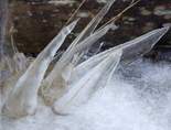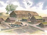 Arne Haldås demonstrerer tresking av korn med "Sluggu" som er et gammelt treskeredskap utformet som et slagverktøy for å få kornet skilt fra aksene det vokste på. Den besto av et skaft, litt over meteren langt, og et tykkere trestykke omtrent en tredel så stort. De ble hengt sammen i en ende med en snor. Ved å svinge skaftet over hodet og ned, ga en sliulen fart og kraft til å dunke løs kornet fra nekene som var lagt fram. Foto av Harald Wågø.