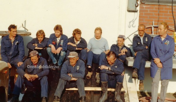 Uke 1309 E-verksfolk, de fleste montører, omkring 1976. Navnpekere: Eystein Ness - Bildet er tatt på rampa på E-verksbygget på Ør. Navnsatt av flere. Utlånt av Knut Arne Selli.