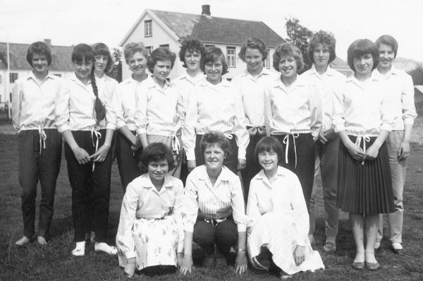 Jentene i 7. klasse ved Verdalsøra skole i 1958. Bildet er tatt ved gammelskolen på Øra hvor de hadde undervisning i håndarbeid. Samtlige 15 sydde likedan overdel eller bluse om en vil. Lupebilde   Jentene i 7. klasse ved Verdalsøra skole i 1958. Bildet er tatt ved gammelskolen på Øra hvor de hadde undervisning i håndarbeid. Samtlige 15 sydde likedan overdel eller bluse om en vil.