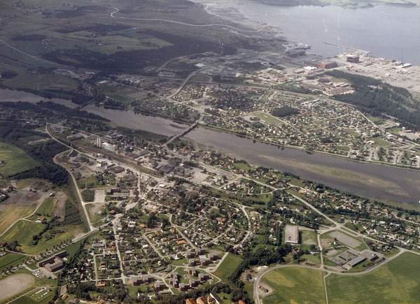 Verdalsøra for 25 år siden. Stekket er ikke oppfylt. Strand Kafe står der fremdeles, mens "Kornmagasinet" er flyttet. Boby'n er ikke påbegynt. Det er litt "snøitt" på Akerområdet. Klikk på lupen.   Utlånt av Oddvar Molde