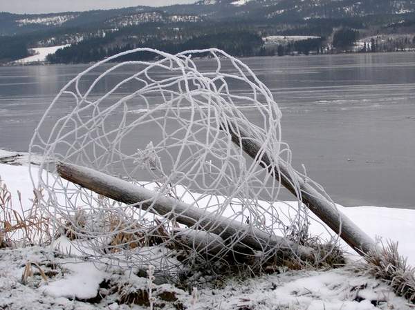 Tåken har den siste tiden pyntet busker og trær med kvite krystaller. Her har den tatt for seg en trådbunt ved Lundselva.