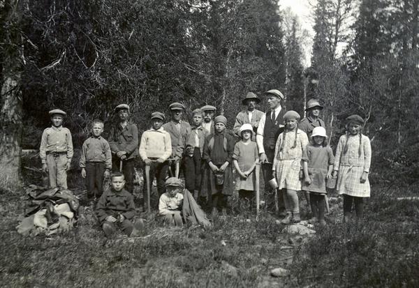 Skoleelever fra Vera skole på skogplanting på Sisselvolden i 1928. Fotograf, lærer Anders Vandvik.