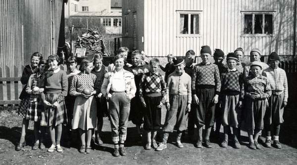 Tredje eller fjerde klasse ved Verdalsøra skole antagelig i 1954. Skolelokalet er Losjelokalet i Feskarvegen. Bildet er tatt av lærer Anders Vandvik og utlånt av hans datter Liv Liberg. Med forbehold om mulige feil i navnene.