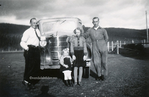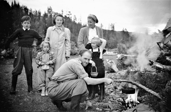 Navnpekere: Eystein Ness - På den tid var det vanlig å ta med seg svartkjel`n på biltur oppover Sogna til Kjærringneset eller andre plasser langs Inna. Ofte var det flere familier som dro sammen og da var det vanlig med lastebil som transportmiddel. Det ble plassert på benker bak på lasteplatten uten noe særlig med sikring av passasjerene. Dette bildet er trolig tatt like ovenfor Gråtøyfossen ovenfor Stormoen. Utlånt av Just Roar Wohlen.