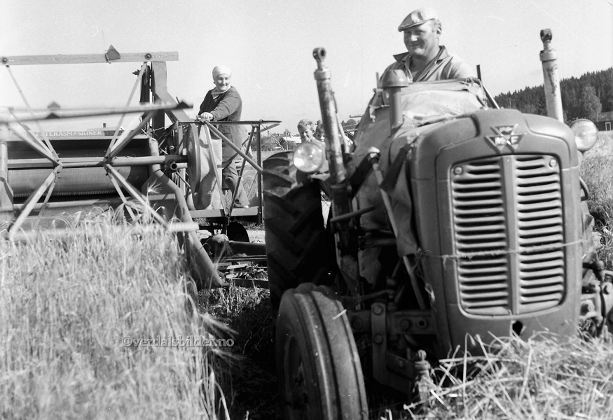 Bonden selv på traktoren og ektefellen på slepetreskeren og knyter igjen sekker. Ikke uvanlig arbeidsdeling under kordhøsten på familiebruk på den tid. Foto av Harald Wågø.