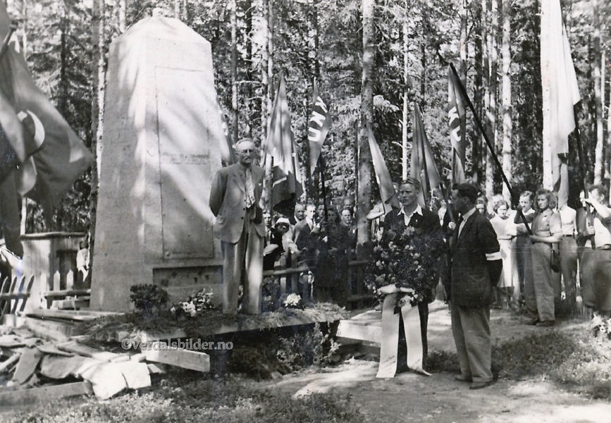 Navnpekere: Eystein Ness - Kransnedlegging og tale av ordføreren ved den nye minnestøtta. Legg merke til at støtta ikke er helt ferdig. Stenarrangementet rundt og navneplata er ikke på plass. Offentlig innvielse av gravstedet skjedde i oktober samme år. Utlånt av Kjell Solvold.