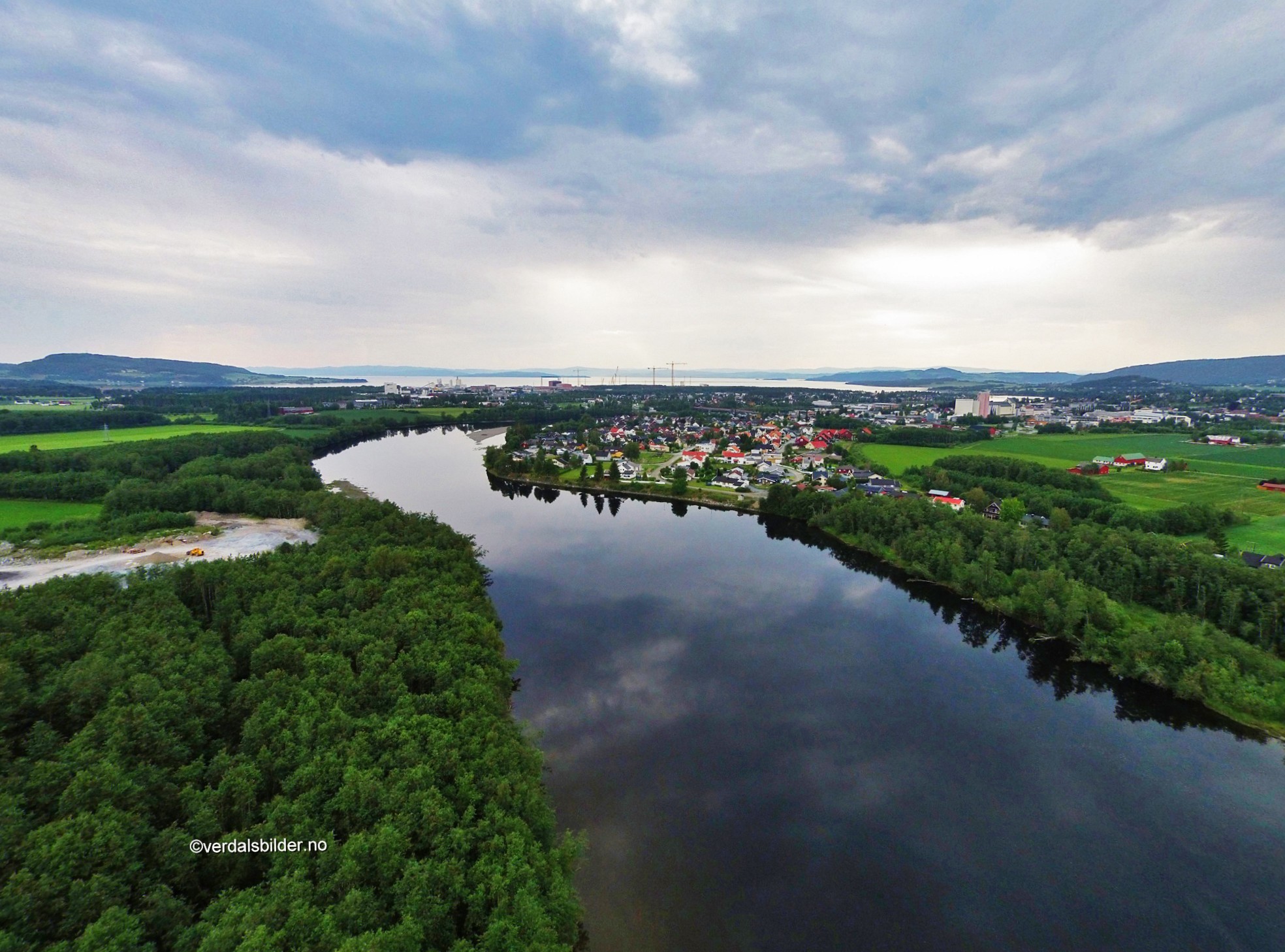 Luftig bilde over Grønnøra med Verdalsøra ved en speilblank elv.